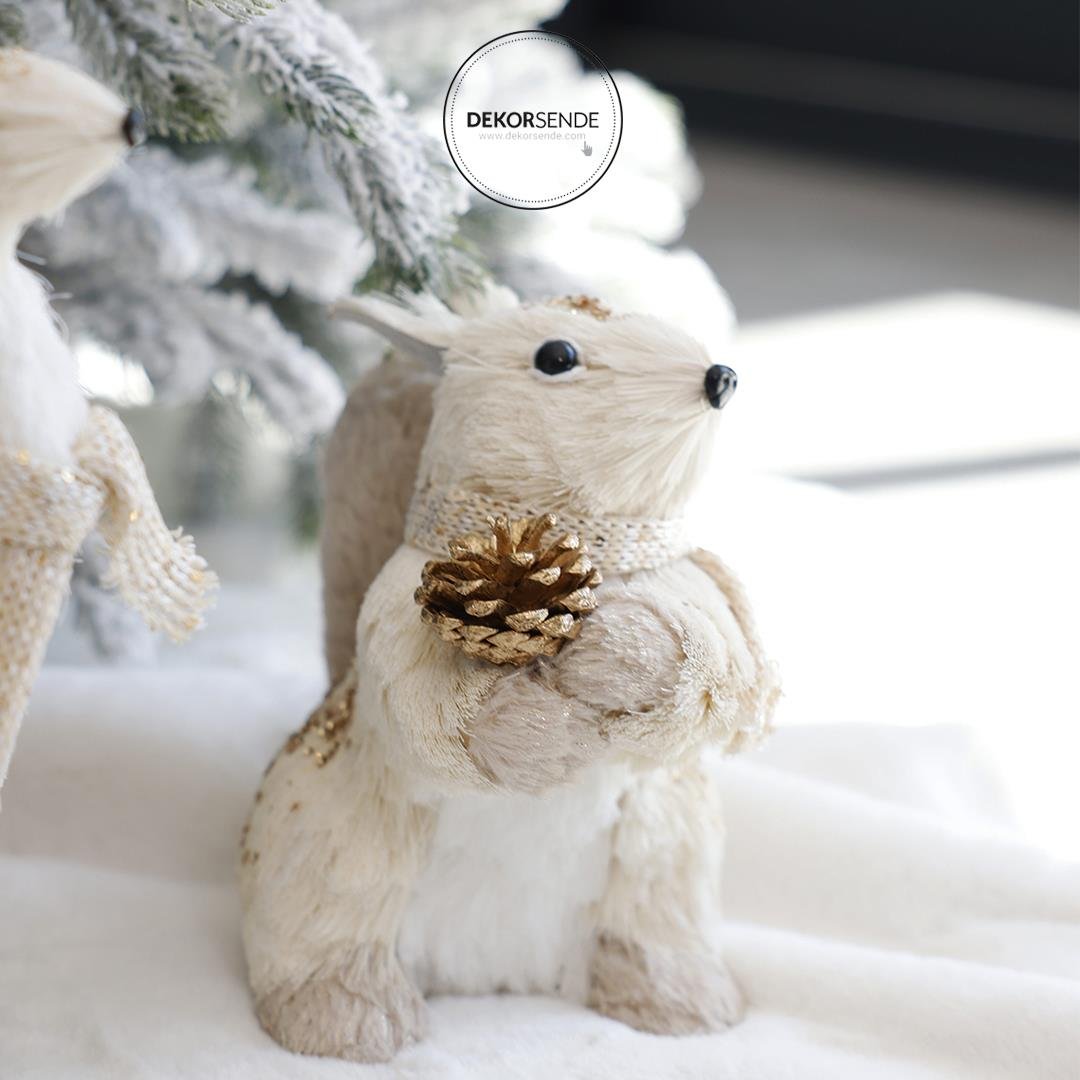 Dekorsende Lüks Yılbaşı Biblo Süs Beyaz Sincap - Altın Atkılı & Kozalaklı (20 cm)