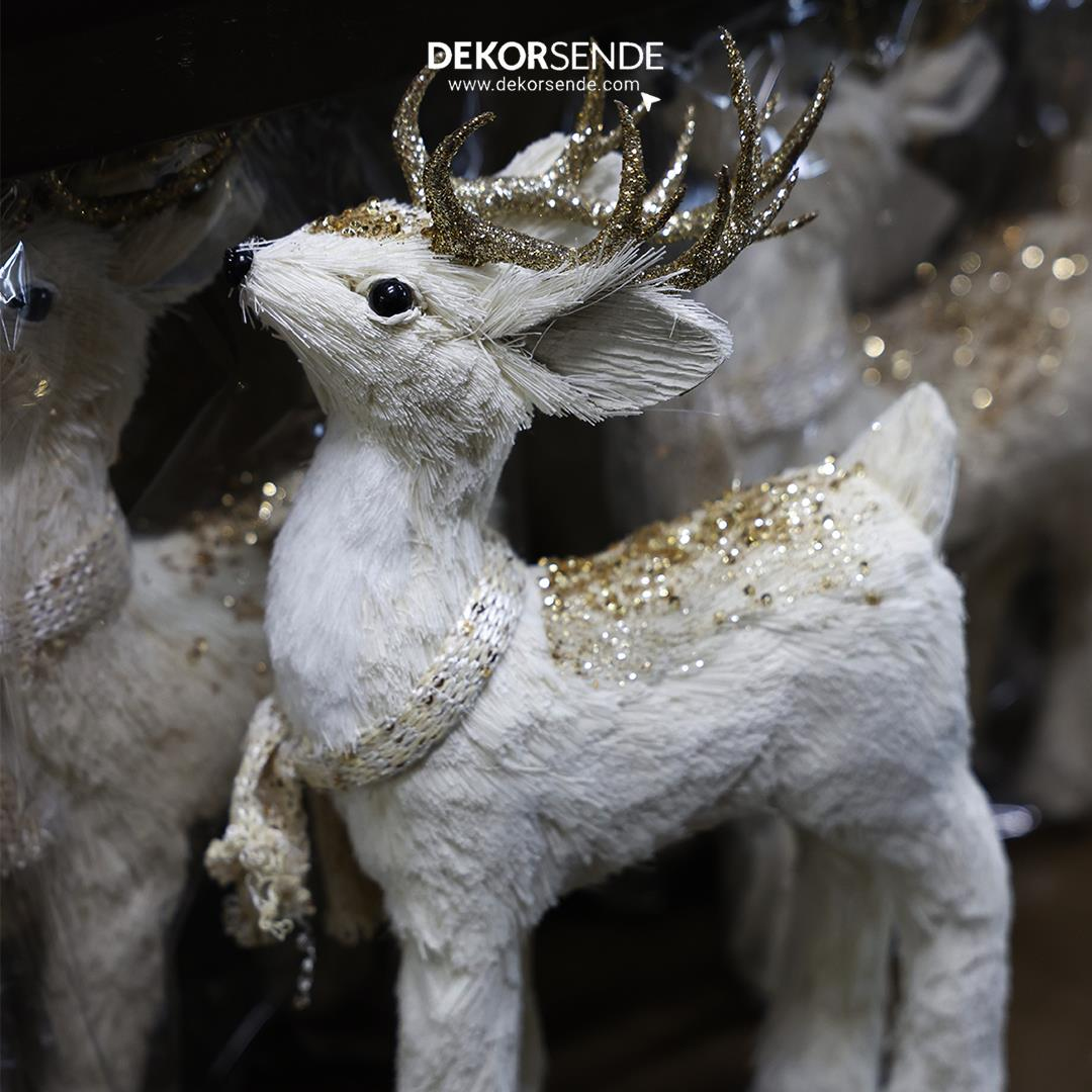 Zarif ve Büyüleyici Tasarım: Yılbaşının vazgeçilmez sembollerinden olan geyik figürü, bembeyaz ve pürüzsüz dokusuyla göz kamaştırır. Altın rengi simli boynuzları, sırtındaki hafif parıltılı işlemeler ve boynundaki uyumlu atkısıyla lüks ve asil bir duruş sergiler.