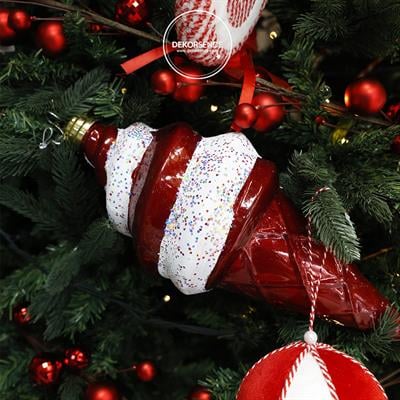 Dekorsende Kırmızı Beyaz Dondurma Külahı Şeklinde Yılbaşı Ağaç Süsü (Renk: Kırmızı-Beyaz, Ölçü: 50 cm)