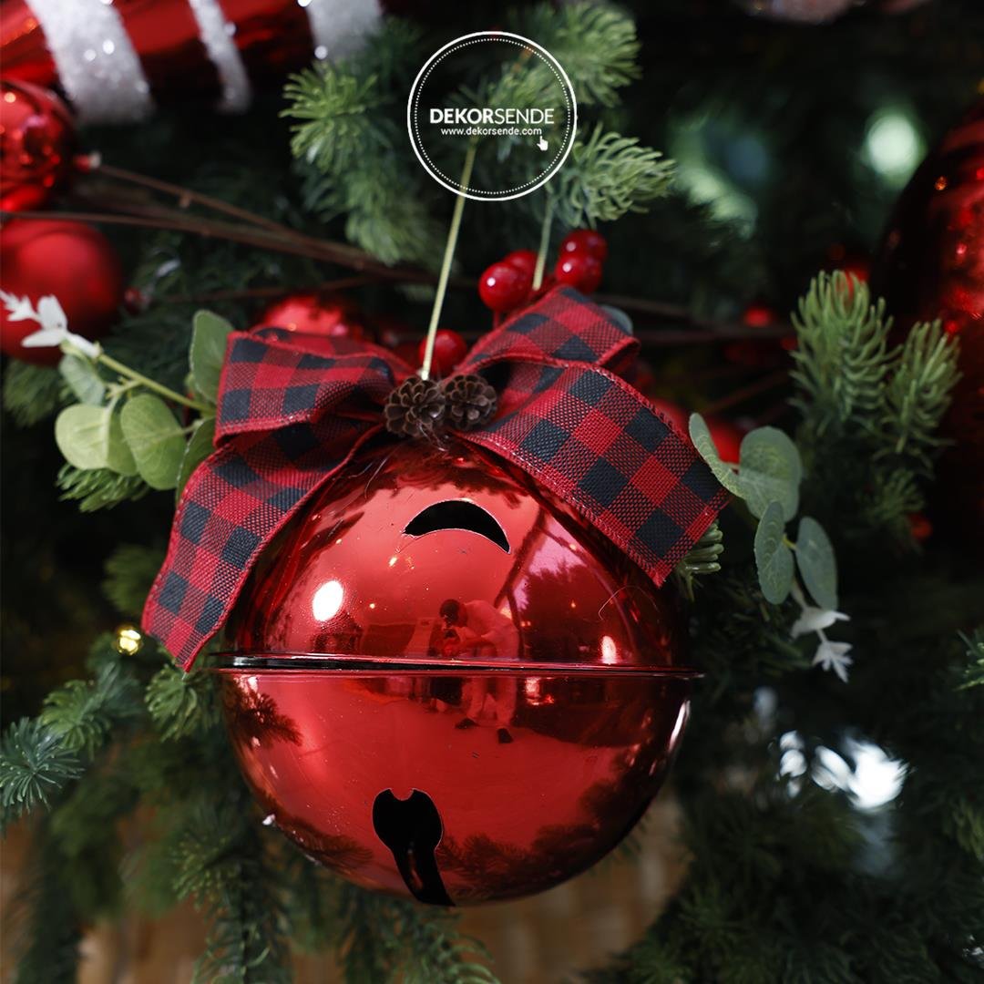 Yılbaşı Temalı Kırmızı Ekose Kurdeleli Büyük Çıngıraklı Top Süs 15 cm