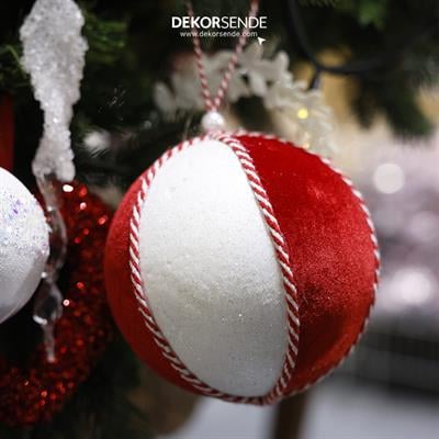 Yılbaşı Temalı Kırmızı Beyaz Fitilli Asılabilir Top Süs 15 cm