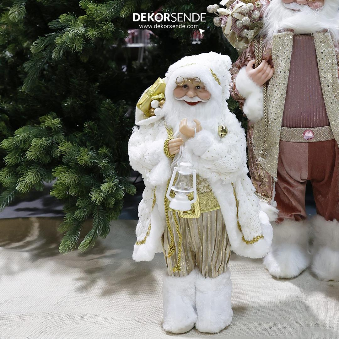 Zarif ve Lüks Tasarım: Klasik Noel Baba figürüne modern ve lüks bir yorum katılmıştır. Beyaz örgü ceket, altın rengi pantolon ve detaylarla süslenmiş aksesuarlarıyla göz alıcı bir şıklık sunar.