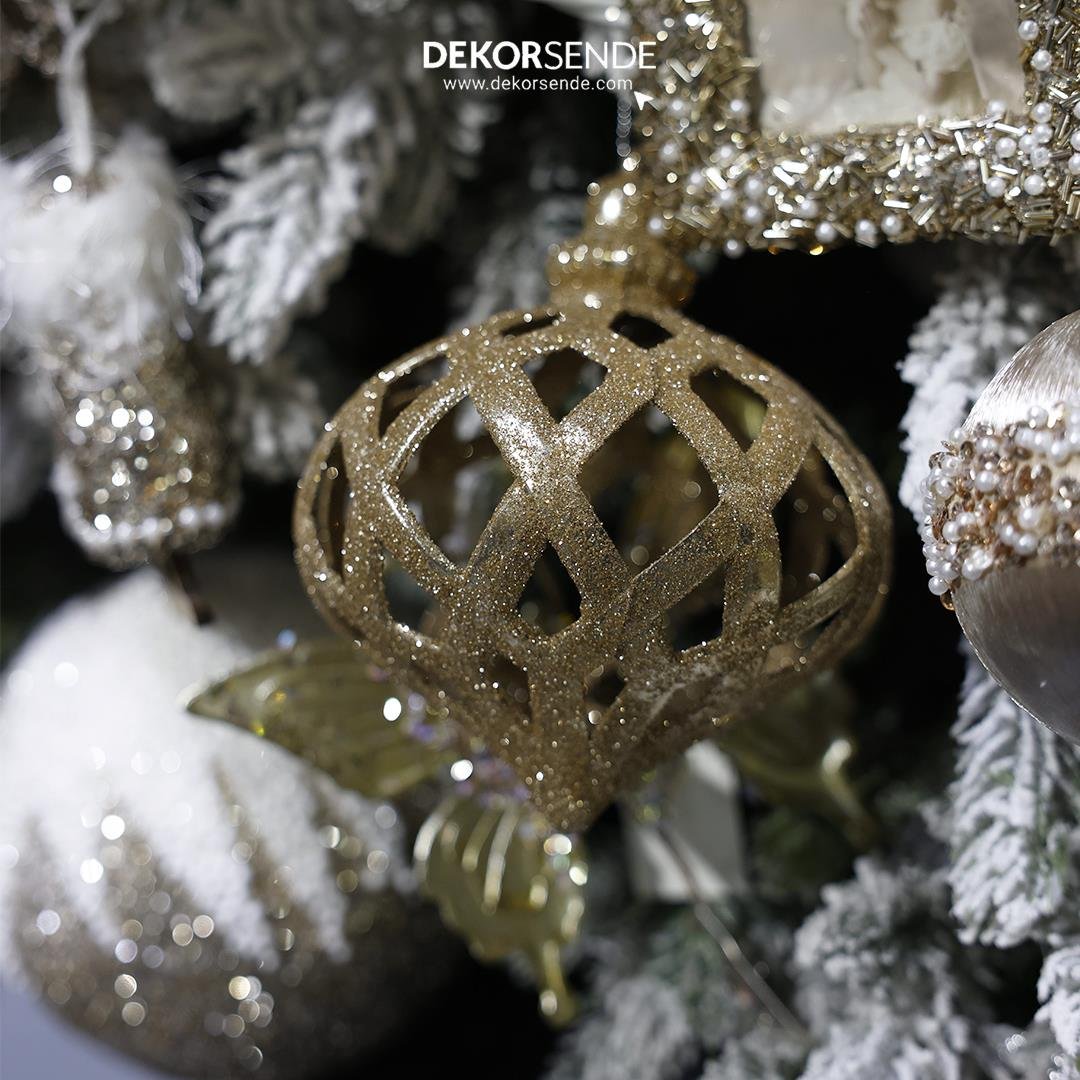 Yılbaşı ağacınıza veya evinizin dekorasyonuna modern ve ışıltılı bir dokunuş katacak, 14 cm boyutundaki bu göz alıcı topaç model süs, şenlikli bir atmosfer yaratıyor. Şampanya rengi simle kaplı, kafes dokulu özel tasarımıyla ışığı yansıtarak etkileyici bir parlaklık sunar. Üst kısmında yer alan kırmızı-beyaz kurdele, küçük kozalak ve kar efektli çam dalları detaylarıyla klasik yılbaşı ruhunu da içinde barındırıyor. Yılbaşı ağacı süslemelerinin yanı sıra, kapı, pencere, şömine veya dekoratif kase içinde de estetik bir dokunuş sağlar. Kaliteli malzemelerden üretilmiş olup uzun ömürlü ve dayanıklıdır. Asma ipi sayesinde kolayca istediğiniz yere asabilir veya farklı dekorasyonlarınıza entegre edebilirsiniz. Sevdiklerinize yılbaşı hediyesi olarak da düşünebileceğiniz özgün ve parıltılı bir seçenektir. Dekorsende farkıyla yılbaşı dekorasyonunuza ayrıcalık katın!