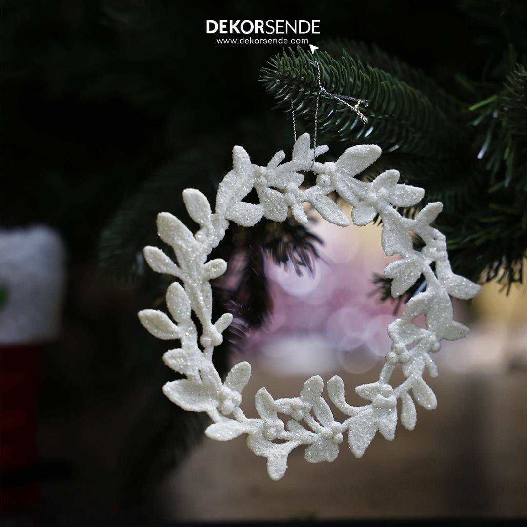 Yılbaşı Temalı Beyaz Simli Yaprak Desenli Çember Süs 15 cm
