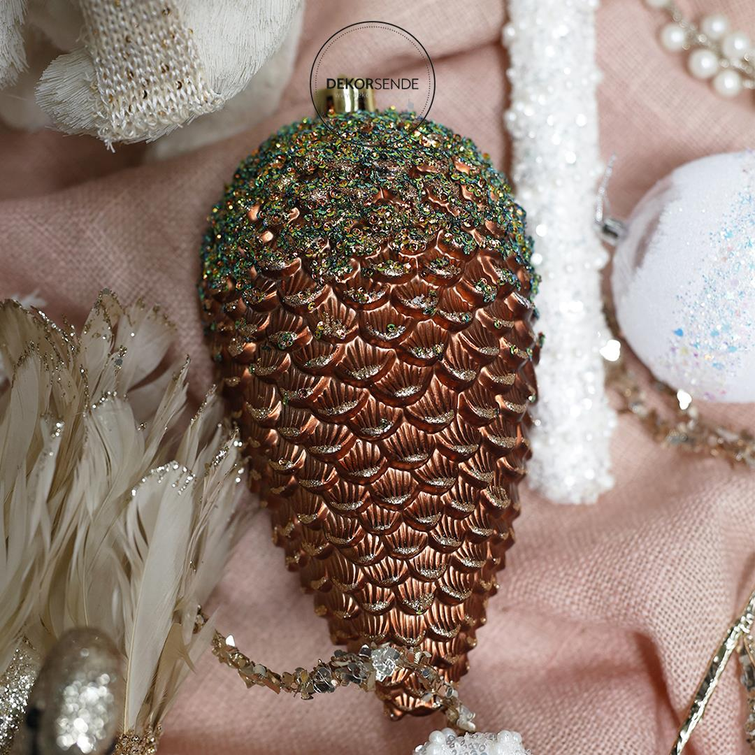 Ürün Adı: 2'li Yılbaşı Çam Kozalağı Süsü - Bronz & Yeşil Simli - 12 cm