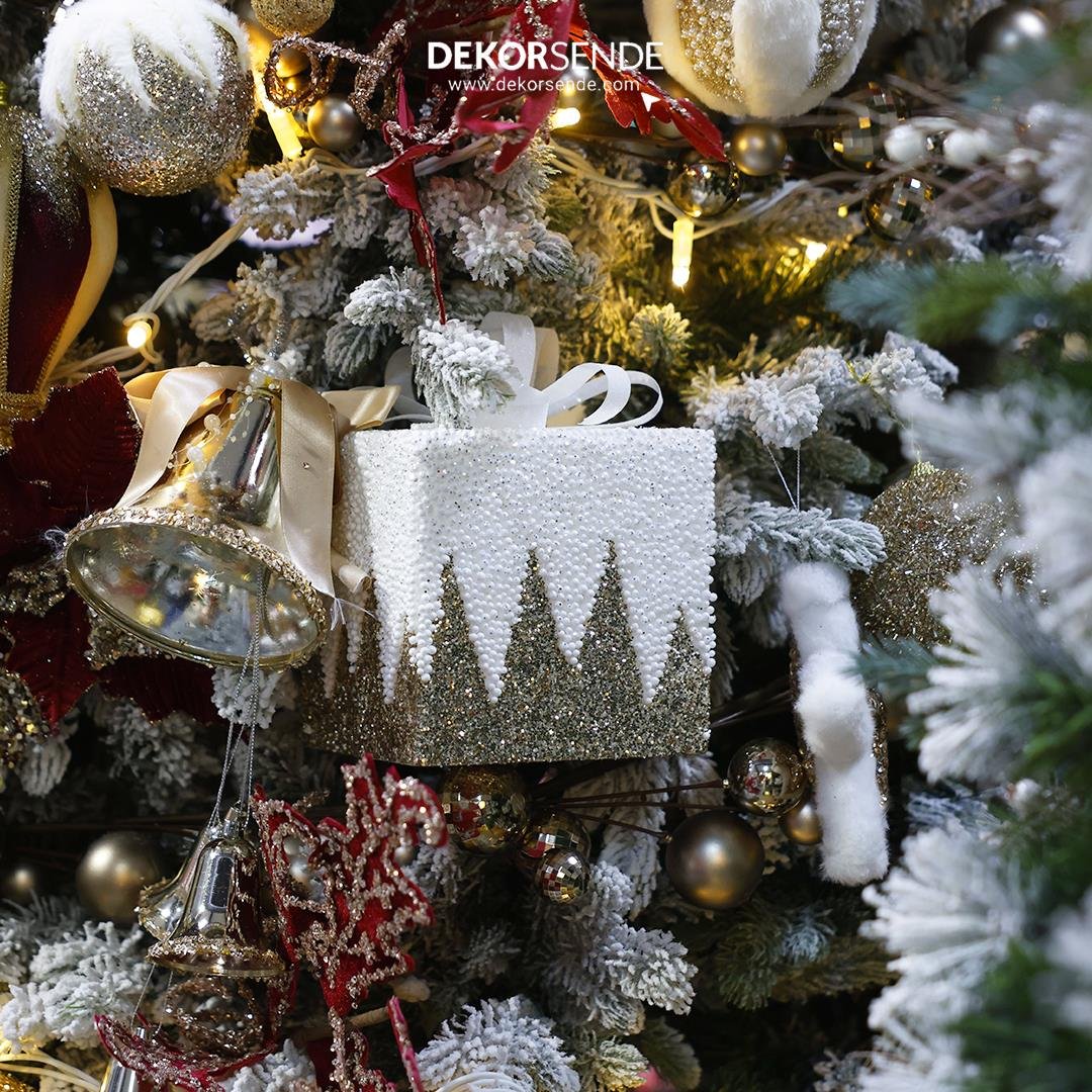 Süs, küp şeklinde bir hediye paketini andırır ve üzerinde kar hissi veren beyaz, kabartmalı simler ile alt kısmında parlak şampanya (açık altın) rengi zikzak desenli simler kullanılmıştır. Bu simli dokular, ışık altında göz alıcı bir parlaklık yayarak ağacınızın daha zengin görünmesini sağlar.