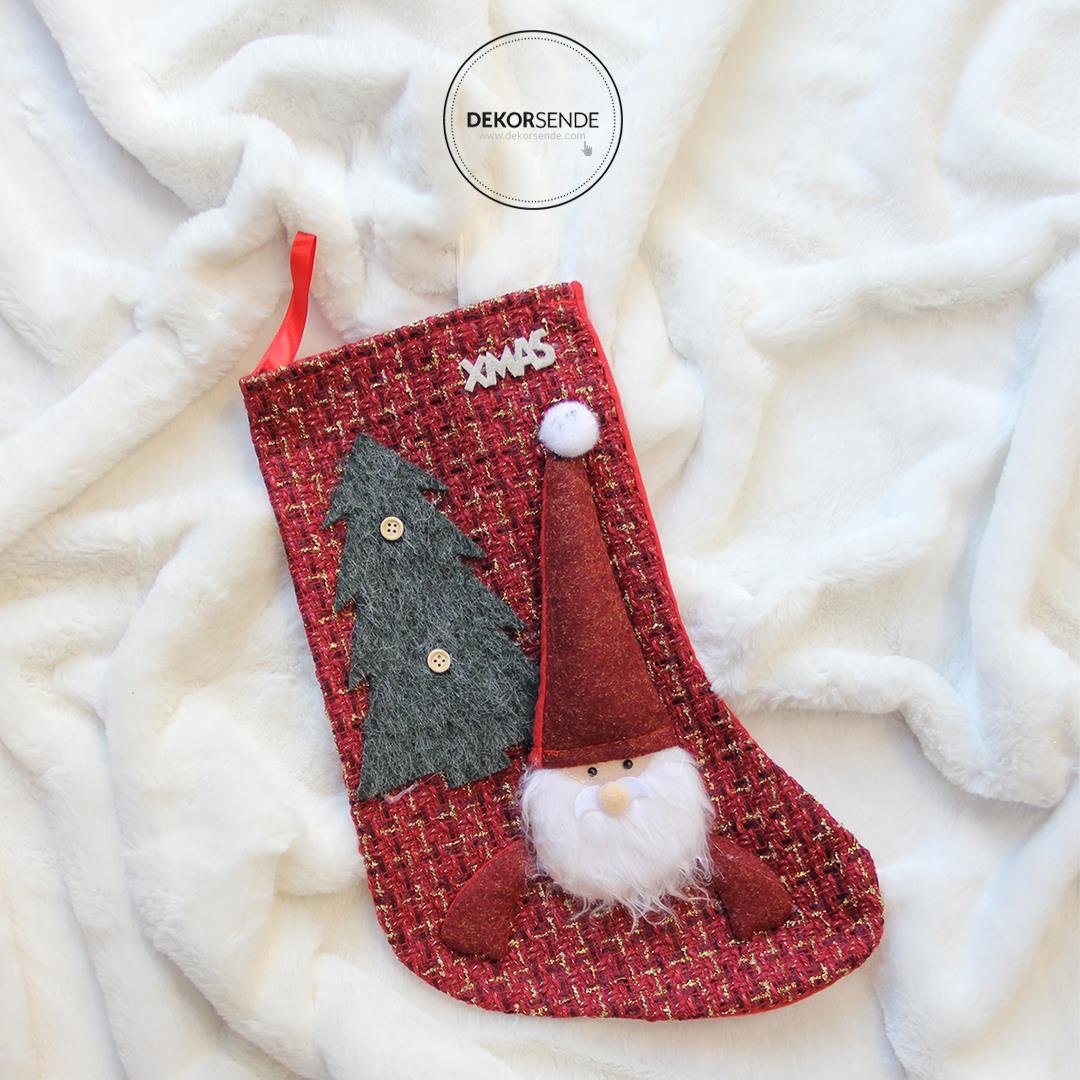 DekorSende markasının bu eşsiz tasarımı ile yılbaşı atmosferini evinizde hissedin. Kırmızı ve simli kumaşıyla göz alıcı bir parlaklık sunan bu çorap, üzerinde sevimli Noel Baba ve çam ağacı figürleri barındırır. Noel Baba'nın kırmızı ve tüylü beresi, beyaz sakalı ve kırmızı botları ürüne sıcak ve neşeli bir hava katarken, yanında yer alan gri renkli, tüylü çam ağacı figürü de yılbaşı temasını tamamlar.