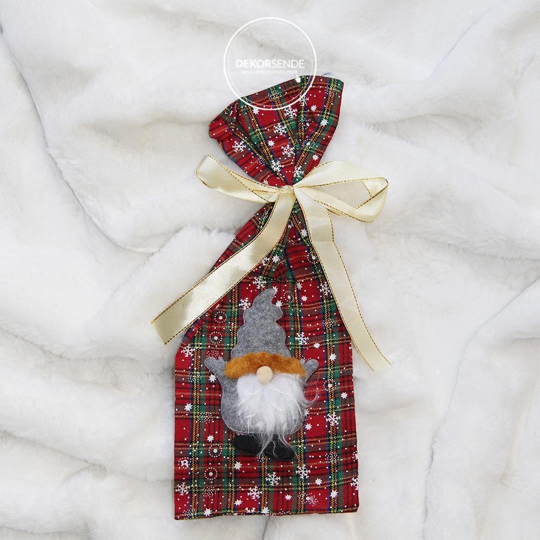Dekorsende Yılbaşı Hediye Kesesi Ekose Desenli Cüce Figürlü Kırmızı Beyaz 20 cm