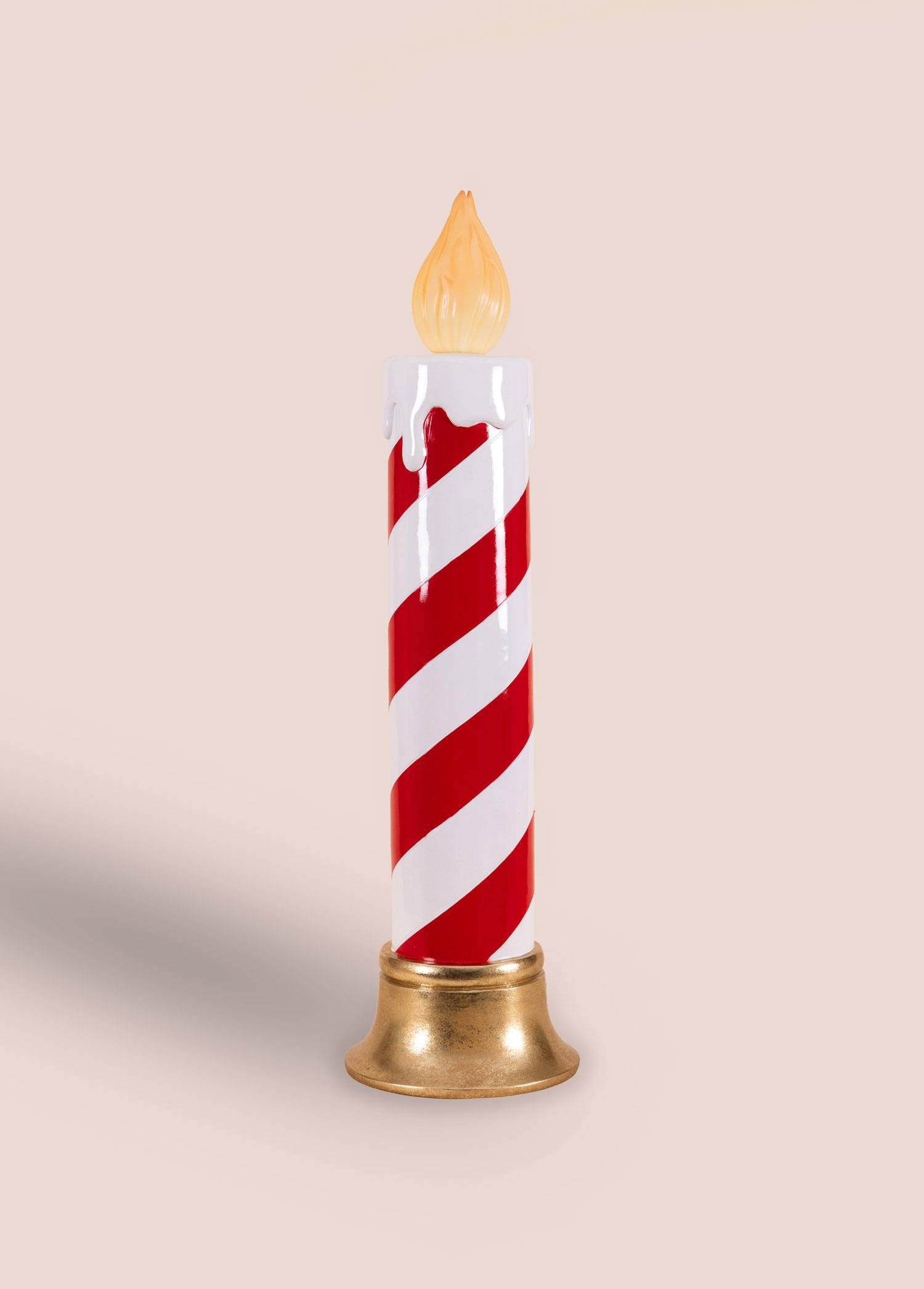 Mumun gövdesi, eğlenceli ve klasik bir görünüm sunan, kırmızı ve beyaz şeker çubuğu (candy cane) deseniyle boyanmıştır. Tepesindeki alev figürü, içerisindeki LED ışık sayesinde gerçekçi ve titrek bir ışık yayarak sıcak ve davetkar bir atmosfer yaratır. Sağlam, altın rengi kaidesi, mumu dengede tutar.