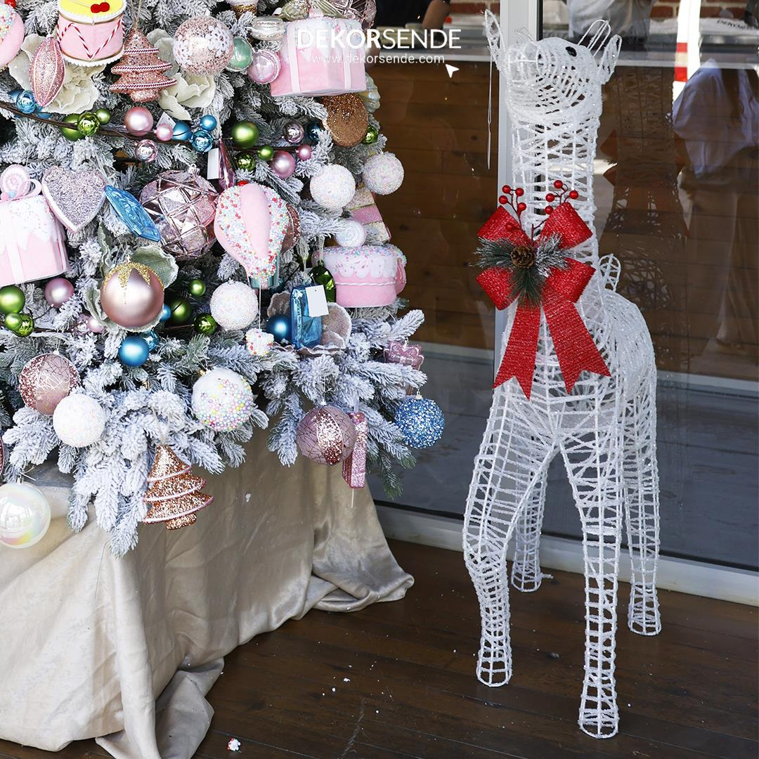 Figür, ince Beyaz rengi tellerden özenle şekillendirilmiş, zarif ve uzun boylu bir geyik silüetine sahiptir. Tellerin üzeri parlak simlerle kaplanarak ışık altında göz alıcı bir parlaklık yayması sağlanmıştır. Geyiğin boynunda, çam yaprağı ve kozalak detaylı kırmızı kadife bir fiyonk bulunması, ürüne hem klasik hem de şık bir dokunuş katar.