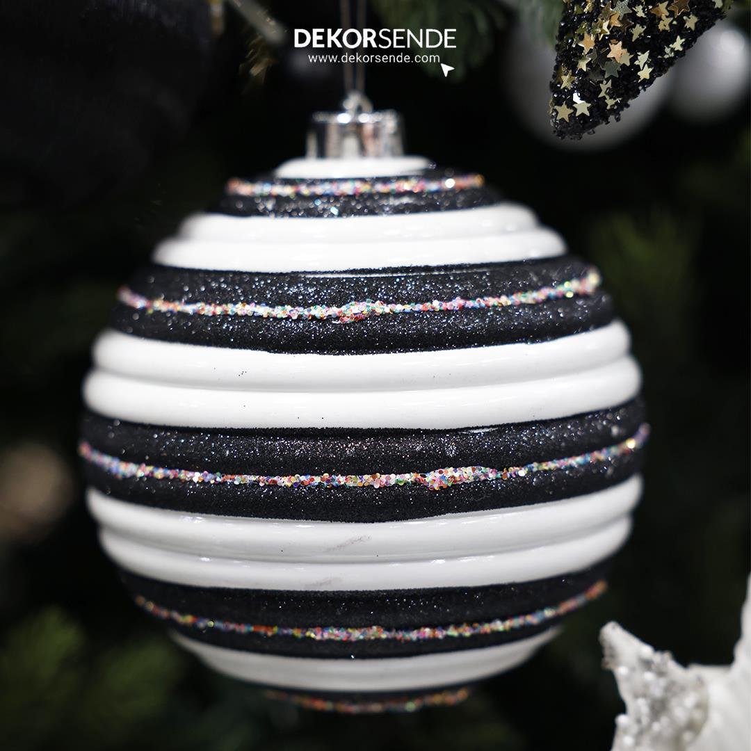 Dekorsende Yılbaşı Top Süsü Halkalı Simli Çizgili Siyah Beyaz 15 cm