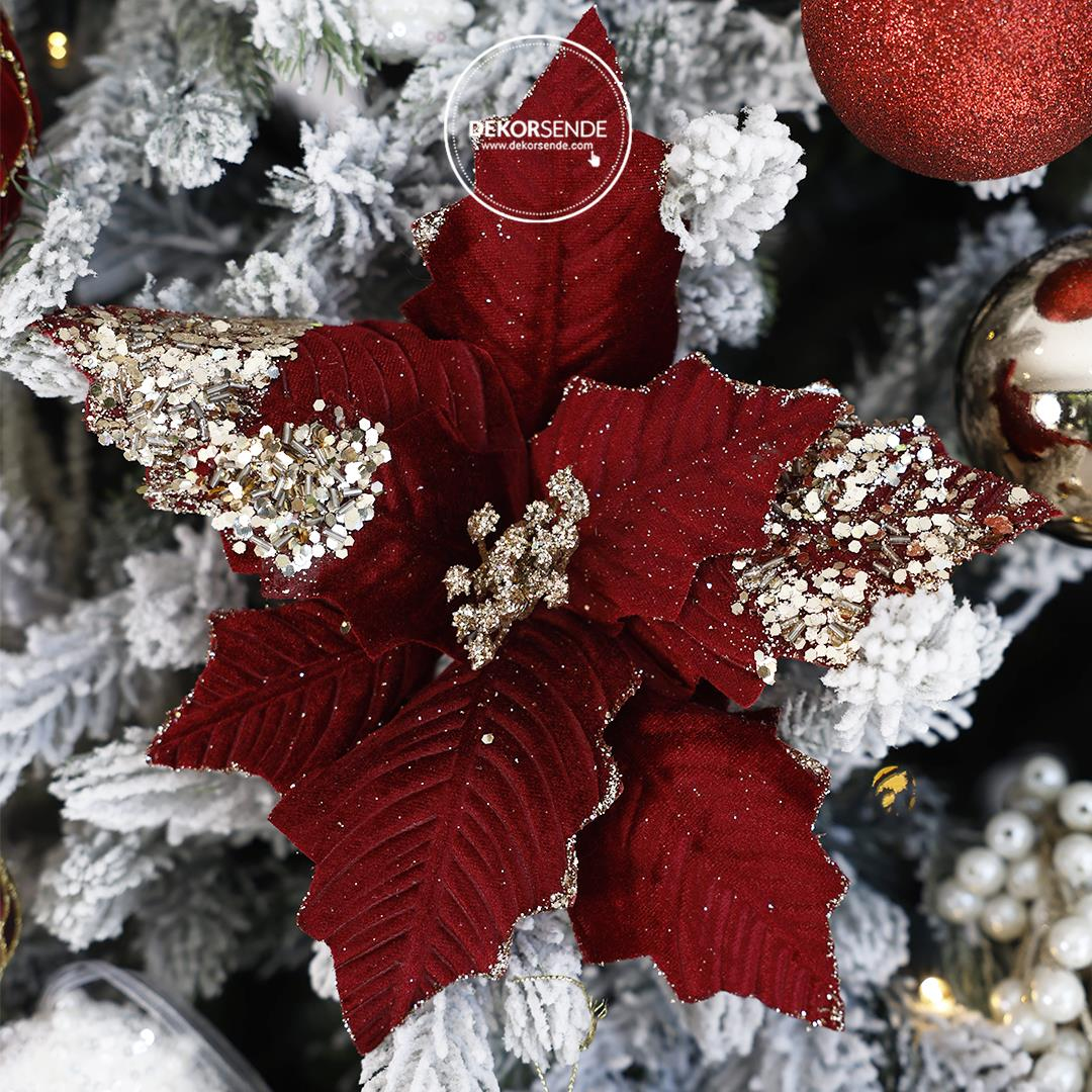 Yüksek kaliteli kadife ve dayanıklı malzemeden üretilen bu dekoratif çiçek, uzun ömürlüdür ve her yıl yeniden kullanılabilir. Bakım gerektirmez, solmaz ve dökülmez; böylece yılbaşı sezonunda pratik ve şık bir dekorasyon çözümü sunar.
